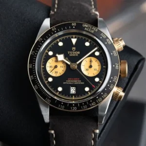 The Tudor Heritage Chrono 70330N pays tribute to the brand’s iconic 1970s Montecarlo chronographs, blending bold retro style with modern craftsmanship. The 42mm stainless steel case frames a striking grey dial with black and orange accents, featuring two sub-dials and a date window at 6 o’clock for balanced functionality. The rotating bidirectional 12-hour bezel adds a practical GMT function, while the screw-down crown and pushers ensure durability and water resistance up to 150 meters. Powered by a self-winding mechanical movement, this watch offers reliability and a 42-hour power reserve—making it a dynamic and sporty statement on the wrist.